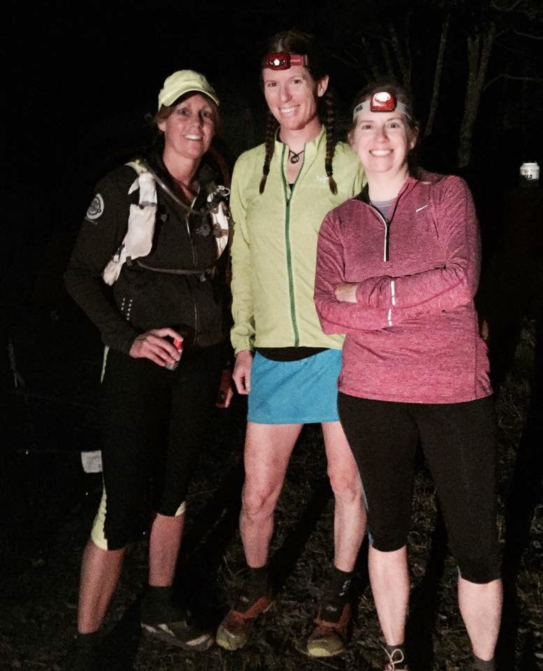 We left Narrows Aid Station down the gravel road with a cup of noodles in my hands. I sipped the warm soup while making our way down the gravel road. Once the road turned to pavement, we were able to run a bit. We alternated running and walking as my knee would allow it, but on the road, I feel that we got more running in than usual. We made our way past the cornfields and out onto the main road. It was after midnight at this point and I am sure that the cars that were passing us thought we were absolutely crazy running on the road with headlamps at that hour. The nap I had taken at the aid station seemed to really do the trick because I was no longer sleepy like I had been earlier. We ran down the road and turned into the woods for our final few miles before the Manning Road Aid Station. We had climbed a mountain and were descending into the valley where the aid station was when we started hitting these cool pockets of air that felt at LEAST 15 degrees cooler than the area around them. It was really getting quite chilly out there. We finally made it down the mountain and saw the aid station ahead with its fire going and we ran on into the clearing. The aid station volunteer asked for my number and then said “Kelly? Your husband is over there in the truck” Now I know I was starting to get delirious out there but not so much as to not remember being married. “Excuse me?” I said. “Yes. Your husband is in the truck waiting for you” “Um, I’m not married” “Well, SOMEone is waiting for you over there” ….Trena and I walk over to the truck and look into the driver side window to see Anne’s husband there and her napping in the passenger seat. LOL She gets up and comes out and we exchange all of our updates as to how things are going. I get my drop bag and drop off a few things I don’t need anymore like my Garmin charger and my first headlamp. I refilled my Roctane bottle and resupplied my food. I then found a stick roller and rolled out my legs particularly my calves. Anne began to ask if I was SURE I was ok. Because if I felt I would not make another aid station it would be best to drop here. I insisted that I was ok to go and so we started off away from the aid station. Anne’s husband was going to drop Trena off back at her car so she got in the truck and since there was a water crossing immediately outside of the aid station, Anne rode in the truck as well so as to not start her run off wet. However, I HAD to run through it because I was still racing and couldn’t be carried ANY of the course. I stepped into that icy water and probably scared the neighbors for miles around with my obscenities coming out of my mouth. That water was FREEZING!!!!! I will say that it does wonders for making sure you stay awake though.