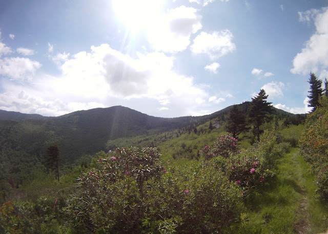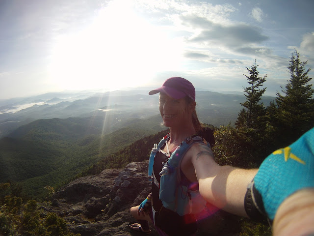 3 1/2 miles into the 3000 foot climb we came again to the water stop we had passed earlier. Here we refilled water bottles before heading on up the mountain. Here is where I also learned of another Luna wearer on the course from the comment, “You are the second person to come through here wearing flip flops” LOL And so we trudged onward and upward. All of the welcome downhill running from earlier was now an uphill battle. It was soul crushing in its never-endingness. At this point, I was running with a fellow Atlanta area runner, Zac. It was refreshing to connect with someone else on the motivations of signing up for this race. We finally made it to the grassy ridgeline and the amazing views. We negotiated the grassy singletrack as carefully as we could and when it finally leveled out a bit, I made an attempt to run. It was slow going but I felt like I was able to make up a little bit of time from the slow uphill trudge. The weather on the ridge was simply phenomenal.