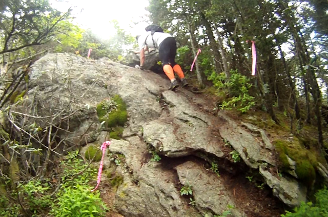 In a last minute change, the race now had a 1/2 mile uphill road run before we hit the trails. Everyone started with the fastest runners at the front eating this hill like it was for breakfast. Most people started it at a jog. This jog quickly devolved into power hiking as the hill got steeper. I found my friend Nikhil and his friend Amy and we hiked along together for a bit. There was not much running this first section. It was steep. VERY steep. We had a few spots were it leveled out and you had the option to either catch your breath or make up time by running …. I chose breathing more often than not. The climb got steeper. The pack started to spread out as it was beginning to get more and more difficult to climb. My Garmin was consistently reading it at a 24% grade … at a few spots it went as high as 33%. I broke out my trekking poles and they helped out immensely. There were ledges that had to be climbed, roots and boulders and trees that all had to be negotiated. Many sections it was actually easier to put my poles away and use my hands to grab the trees to help pull myself up. There were boulders the size of a house with a small crack between them that had to be squeezed through before going up and having to negotiate a drop off while hugging the rock. This all culminated into an opening in the trees ahead which presented one of the most amazing views of the race.